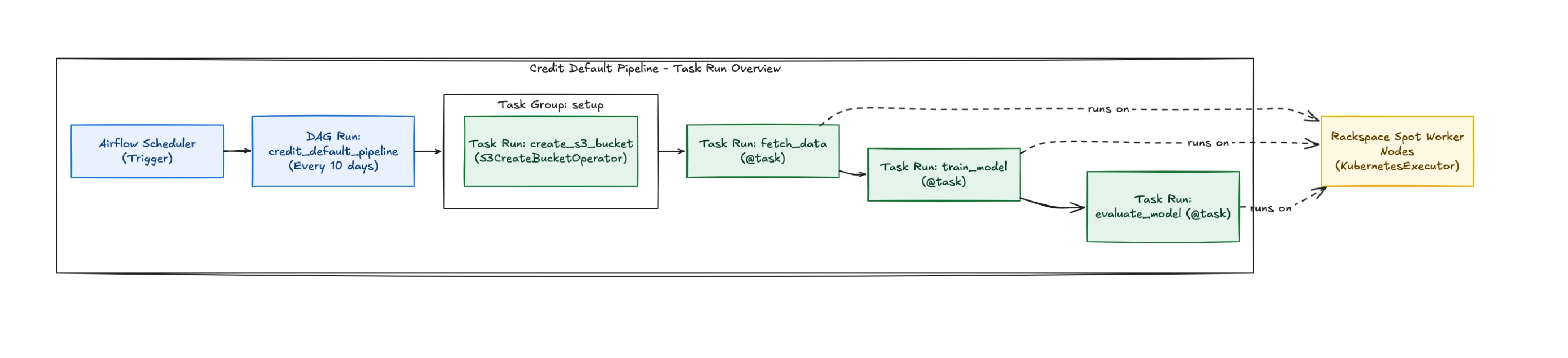 The DAG in this example represents a simplified version of that workflow. It periodically retrains the model using stored loan data and evaluates its performance, helping ensure that the credit risk model stays up to date as new data becomes available.