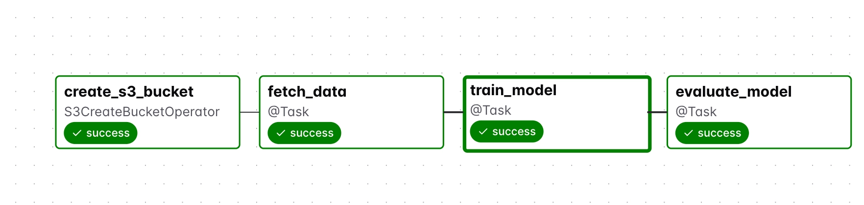 Also, because we used s3, the task was able to continue from where it stopped and get the last data it needed. And so train_model could read the data directly from s3 and continue the DAG execution from there. This is a simple example of checkpointing with S3.