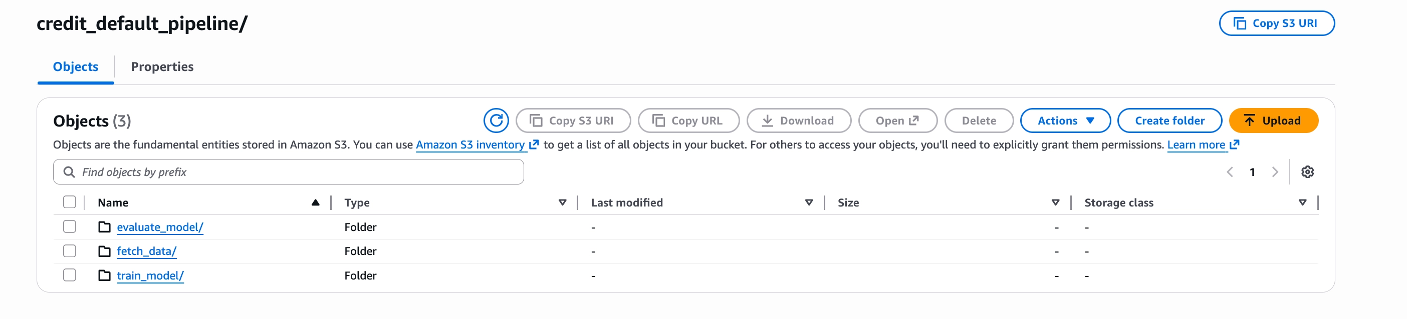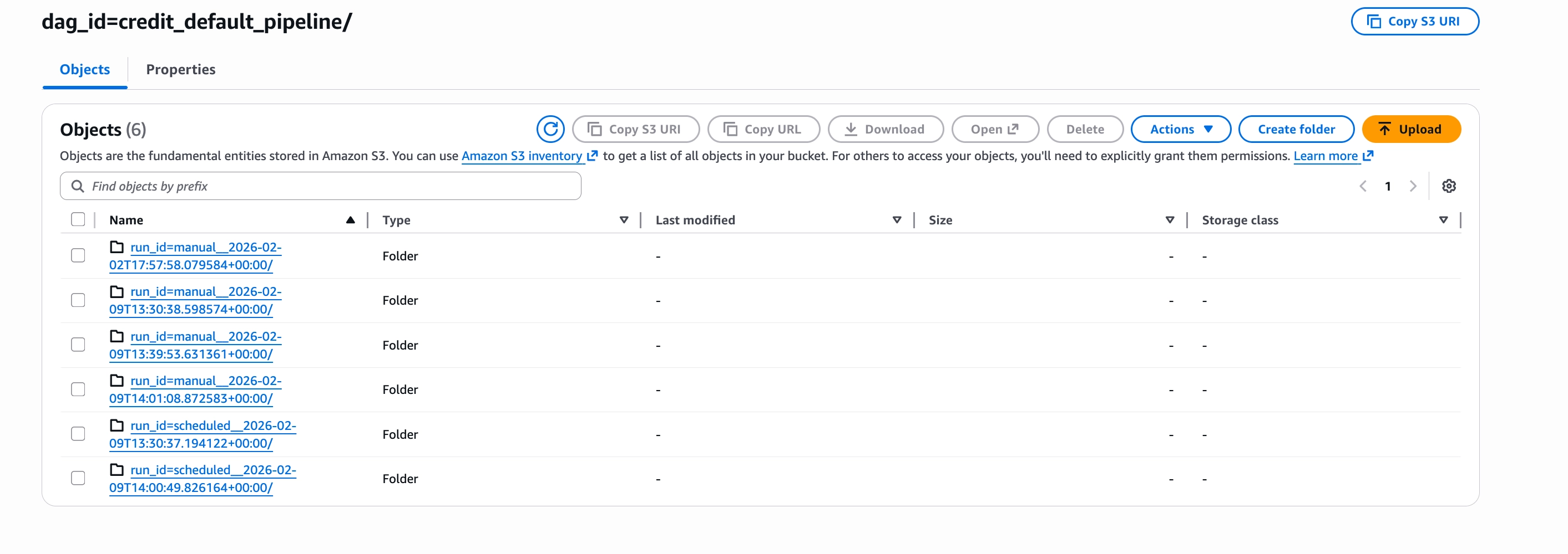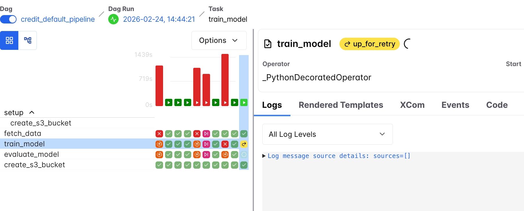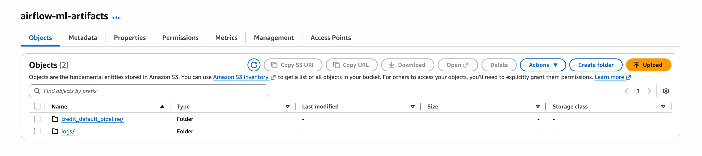 task_log_reader: "s3.task"This is why the airflow-ml-artifacts bucket contains two folders: credit_default_pipeline/ for intermediate task data and logs/ for Airflow logs.