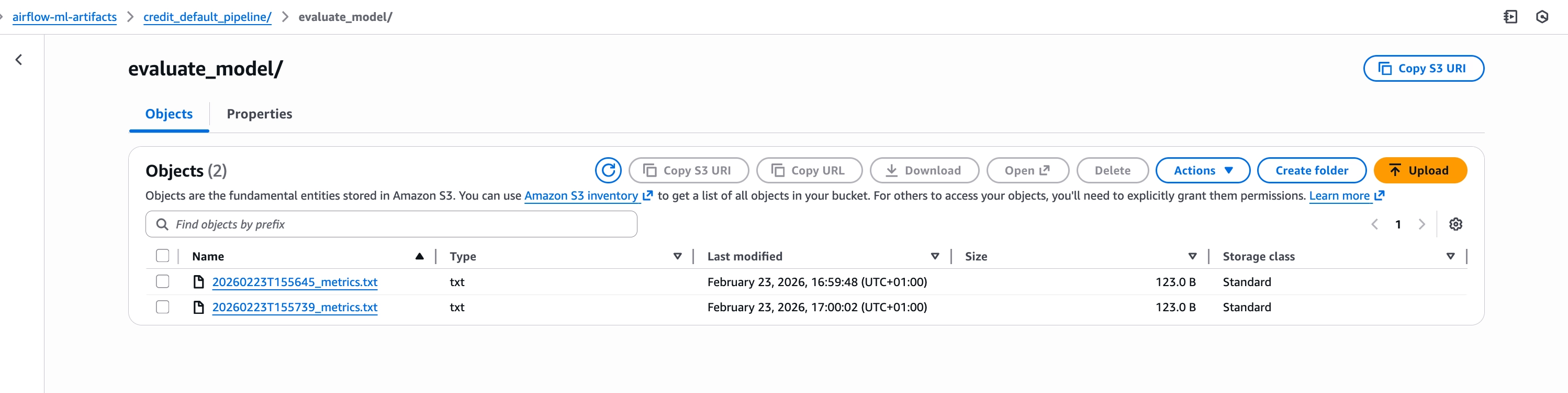 Navigate to the evaluate_model/ directory in S3 to confirm that metrics.txt was saved successfully.